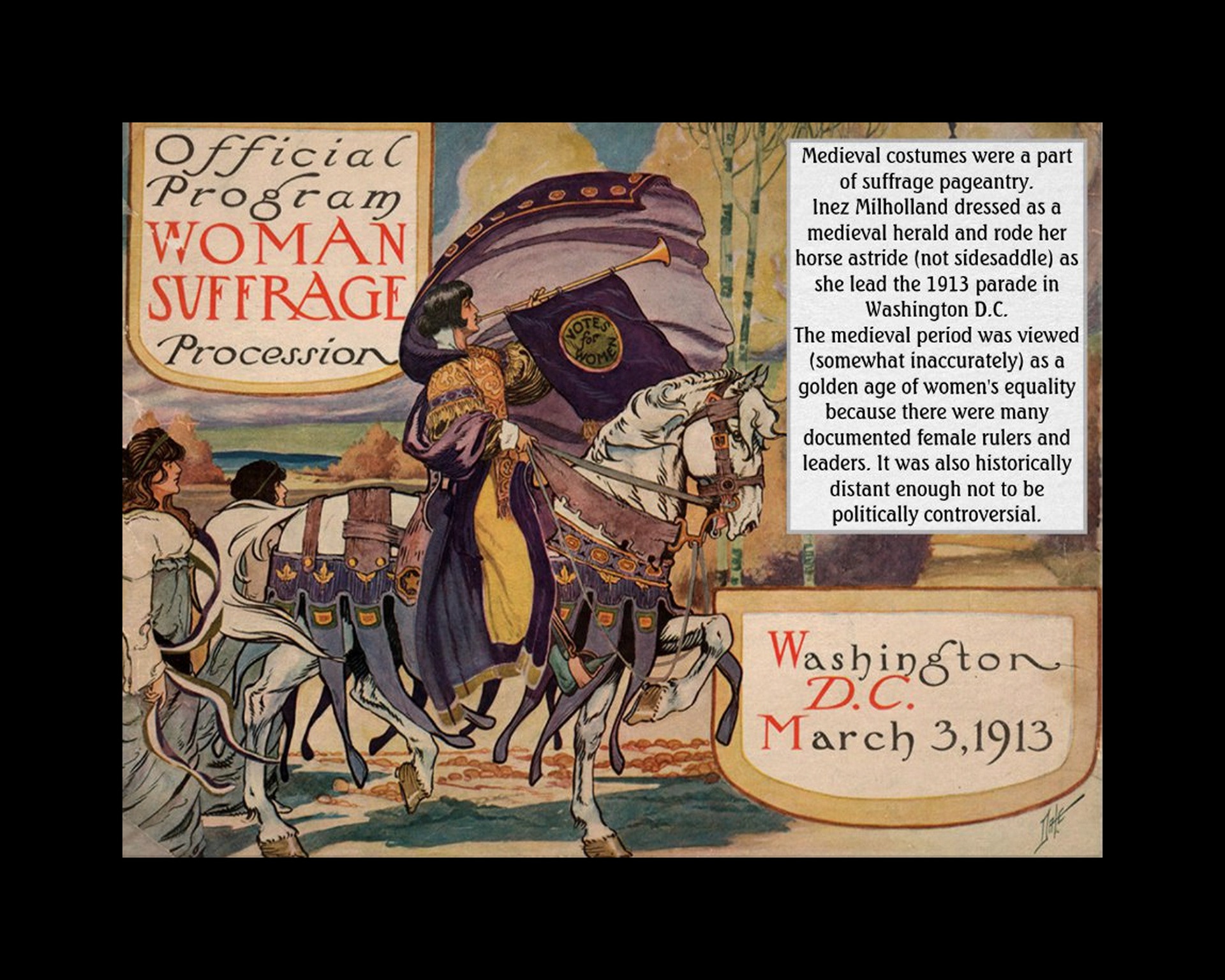 The second section focused on the fight for women’s suffrage with two floats illustrating past and present: the first had a tableau vivant (live painting) of humble women and ashamed men representing the “patriarchy” in 1840 and the second featured “women of today” (1913) in cap and gowns with no men. A troop of women cavalry were also in this section.