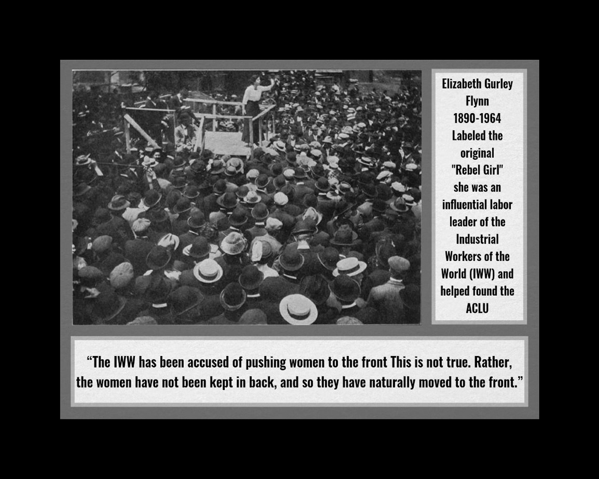 Elizabeth was one of the most influential labor leaders in America. At 16, she was expelled from school for giving a speech entitled “What Socialism Will Do for Women.” By 17, Flynn was heavily involved in the Industrial Workers of the World (IWW) and took an active role in the Spokane Free Speech Fight of 1909. Flynn was part of the famous 1912 “Bread and Roses” strike at the Lowell Textile Mills and the 1913 Patterson Silk Strike. As a female leader in the mostly male IWW and she explained her prominence with this quote, “The IWW has been accused of pushing women to the front This is not true. Rather, the women have not been kept in back, and so they have naturally moved to the front.”