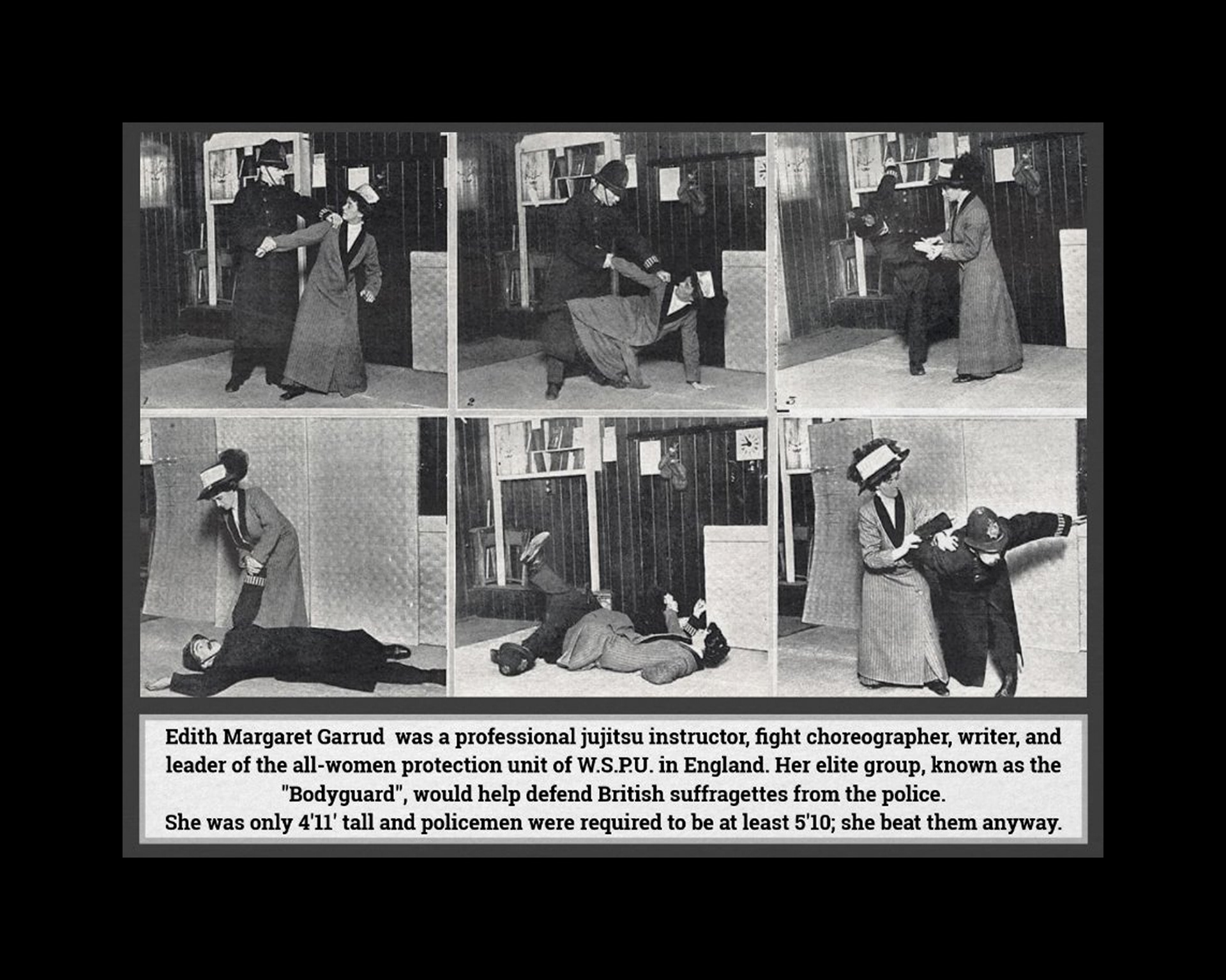 English suffragette Edith Maragret Garrud (1872-1971) was a professional jiu jitsu instructor, writer, fight choreographer, and leader of the “Bodyguard”, an elite all-woman fighting group that protected members of Emmeline Pankhurst’s group, the Woman’s Political Suffrage Union (WPSU).
